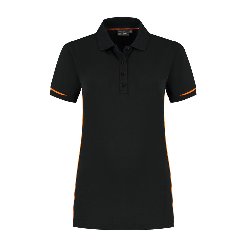 Poloshirt, 50% gerecycled polyester / 48% organisch katoen / 2% elastaan, GRS gecertificeerd, 210 gr/m2, piqué, ladies fit, contrast piping, plat gebreide polo- ribkraag, 4- knoopsluiting, korte mouw met 1x1 ribboord en 3D Santino logo transfer op onderzijde.